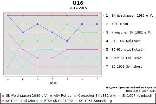 Die Grafik zeigt den zeitlichen Verlauf der Platzierungen einer Mannschaft an.